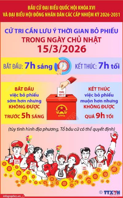 Chính trị - Ngoại giao Bầu cử Quốc hội và HĐND: Cử tri cần lưu ý thời gian bỏ phiếu trong ngày Chủ Nhật 15/3/2026 14/03/2026 18:36