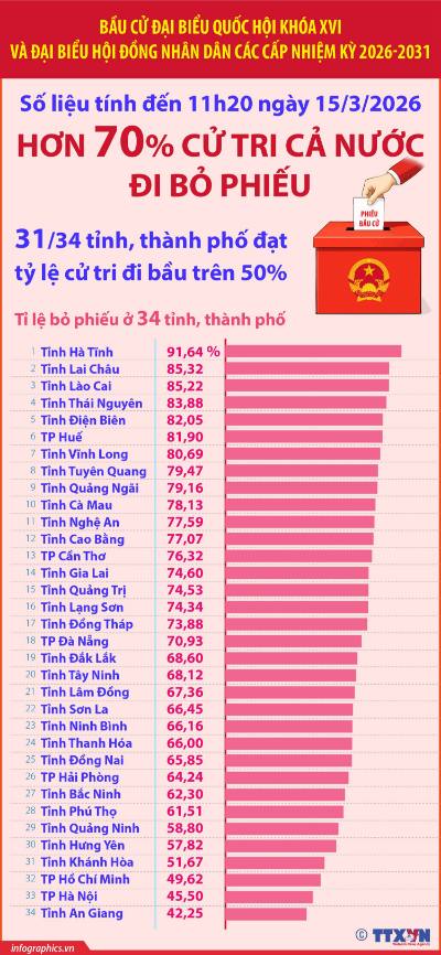 Chính trị - Ngoại giao Bầu cử Quốc hội và HĐND: Hơn 70% cử tri đã đi bỏ phiếu (tính đến 11h20 ngày 15/3/2026) 15/03/2026 13:34