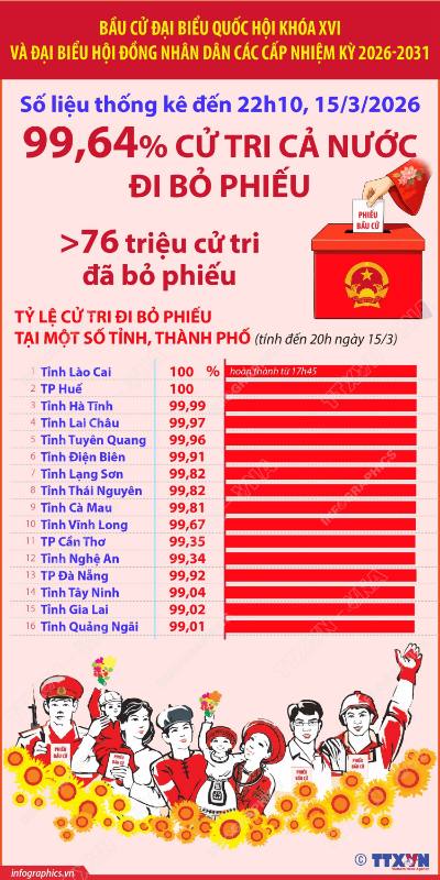 Chính trị - Ngoại giao Bầu cử Quốc hội và HĐND: 99,64% cử tri cả nước đi bỏ phiếu (số liệu thống kê đến 22h10 ngày 15/3/2026) 15/03/2026 23:34