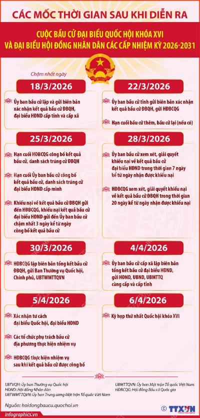 Chính trị - Ngoại giao Các mốc thời gian sau khi diễn ra cuộc bầu cử Đại biểu Quốc hội khóa XVI và đại biểu HĐND các cấp nhiệm kỳ 2026-2031 16/03/2026 05:00