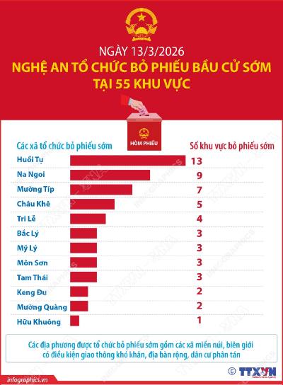 Ngày 13/3/2026: Nghệ An tổ chức bỏ phiếu bầu cử sớm tại 55 khu vực