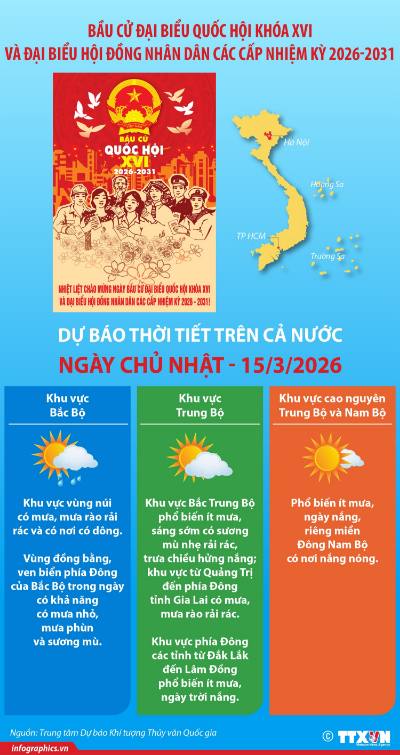 Bầu cử Quốc hội và HĐND: Dự báo thời tiết trên cả nước ngày Chủ nhật - 15/3/2026